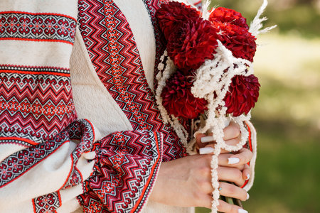 A close-up showcases hands adorned with intricate red and white Ukrainian vyshyvanka embroidery holding a vibrant red floral crown, symbolizing cultural traditions and heritage