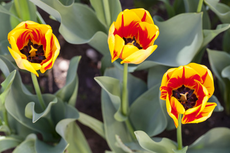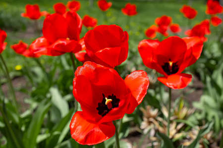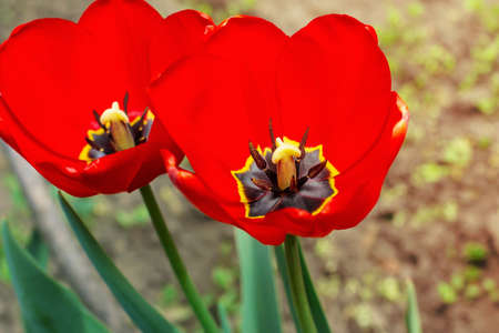 Three vivid opened red tulip in macro. Picturesque background of beautiful red and yellow flower. View from above. Pestle and stamen close up.