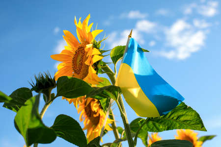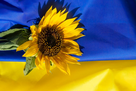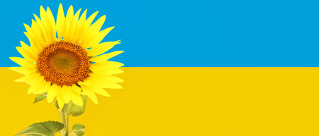 Sunflower on the Ukrainian Flag, Symbols of Ukraine. Copy Space for Text.