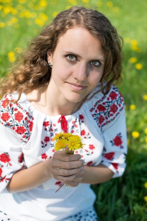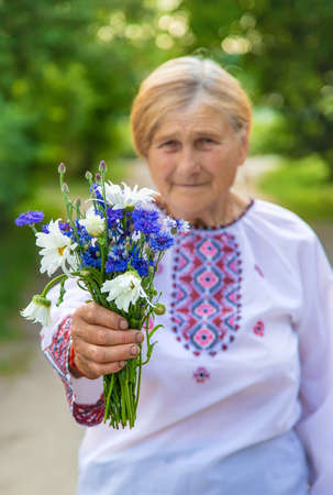 An old Ukrainian woman in an embroidered shirt with a bouquet of flowers. Selective focus.