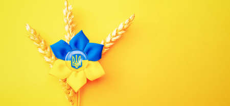 Yellow blue background. Ukrainian flower trident symbol with wheat grain ear isolated on yellow banner. Support Ukraine concept