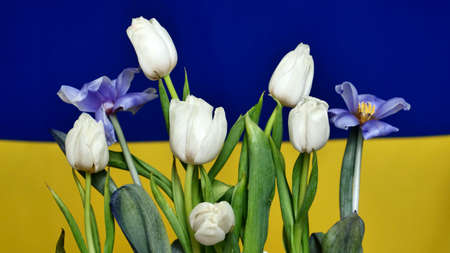 spring flowers of blue and yellow tulips lie on the Ukrainian flag. Ukraine will win and be reborn. Support for Ukraine. stop the war. Independence Day. Belief in victory