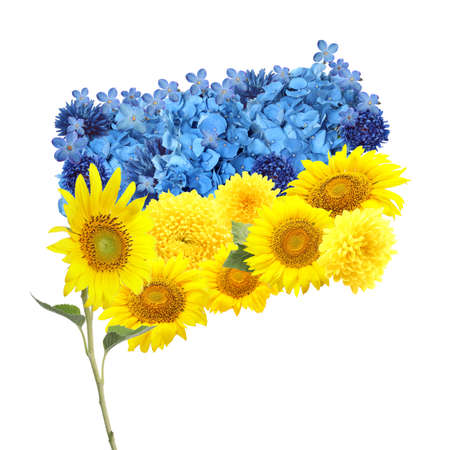 Blue and yellow stripes with colored flowers close-up (flag of Ukraine, the war in Ukraine- concept)