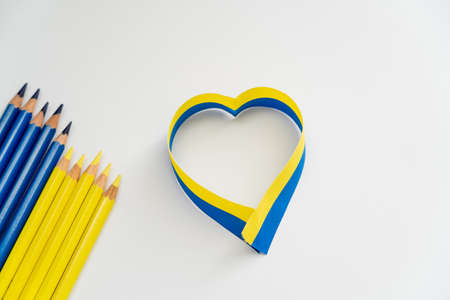 Top view of blue and yellow ribbon in heart sign near color pencils on white background