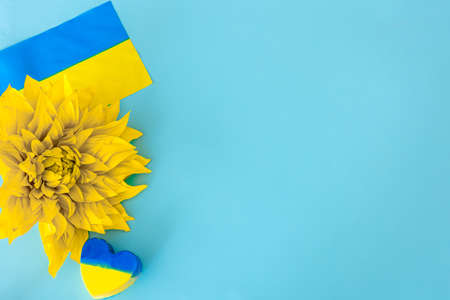 Flat lay background, patriotic composition with Ukrainian symbols.