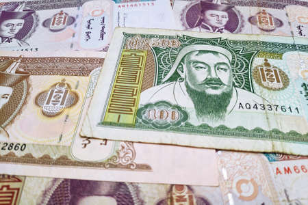 Stack of Mongolian tugrik banknotes as background.