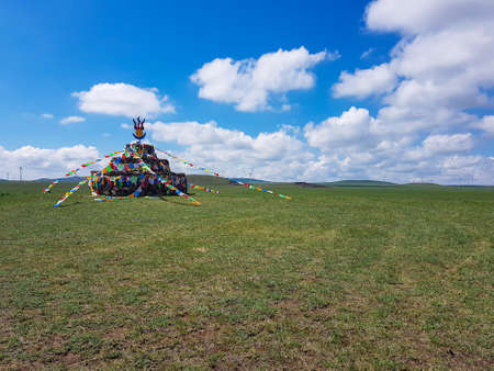 Heap of stones (Aobao) build on a vast pasture in Xilinhot in Inner Mongolia. The heap has a lot of colorful prayer flags attached to it. Endless grassland. Blue sky with white clouds. Religious place