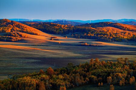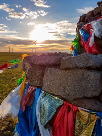 Heap of stones (Aobao) build on a vast pasture in Xilinhot in Inner Mongolia. The heap has colorful prayer flags attached to it. The sun is setting behind the horizon. Golden hour. Wind turbines