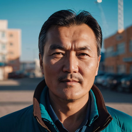 A man with short hair gazes into the camera, exuding confidence and poise. Urban setting. A resident of Kazakhstan, a cute man of 50 years old. A grown man, confident in his abilities. AI generated.