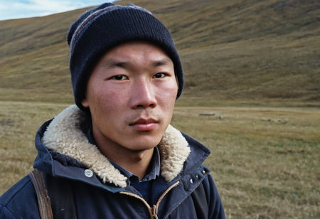 A Chukchi man stands confidently amidst the rolling hills of Chukotka, dressed in warm layers that reflect his cultural identity.