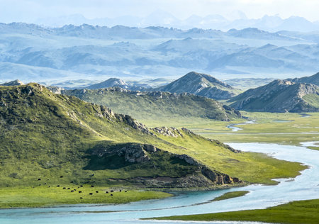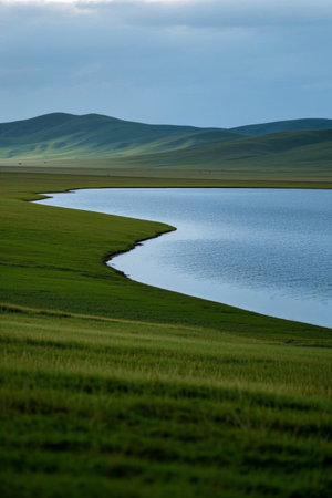 Mongolian landscape with mountains, grassland and river.
