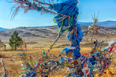 Sacred pillars with tied ribbons on Cape Burhan of Olkhon Island. Buryat traditions. Shamanistic and buddic rites of Lake Baikal. Olkhon Island, Baikal Lake , Buryatia republic Russia