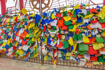 Buddhist flags at the gate of the Buddhist temple complex The Golden Abode of the Buddha Shakyamuni in Elista, Russia