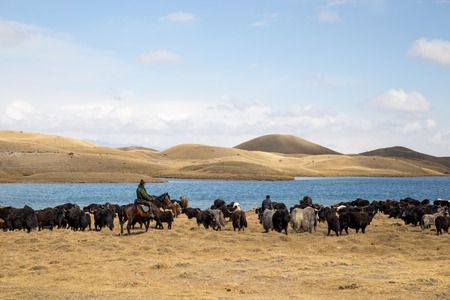 Lake Tulpar, Kyrgyzstan - October 07, 2014: Photograph of yak shepherds on horses in Southern Kyrgyzstan