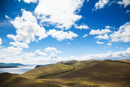 steppe hills in the middle of the summer against blue sky and white clouds