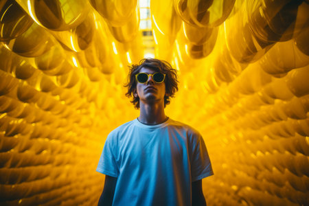 a man in sunglasses standing in front of yellow balloons