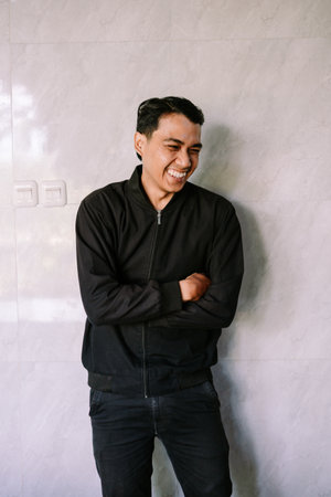 A confident young Asian man stands against a light gray tiled wall, looking to the side with a slight smile. He wears a stylish black bomber jacket with arms crossed, portraying a sense of calm and