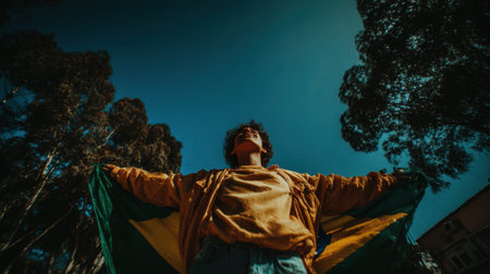 A young person stands with their arms outstretched, bathed in ethereal light, amidst a surreal forest.