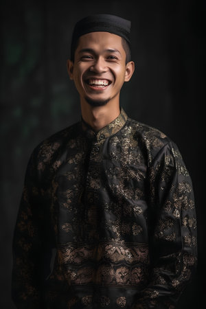 Portrait of a happy young muslim man smiling on dark background