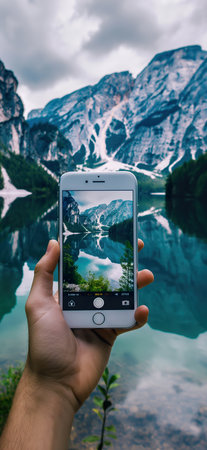 A hand holds a mobile phone making a photo of a mountain landscape with lake