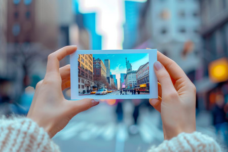 closeup shot of person holding mobile phone in hand and taking photo of beautiful sunset downtown of big city with skyscrapers, urban photography with smartphone camera. High quality photo