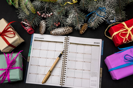 Plans for new year. Open diary on table with gift boxes and fir branches