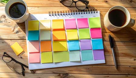 Flat lay of a monthly calendar made entirely of colored sticky notes on wooden desk, each day marked with events and deadlines, coffee mug and pen nearby, morning light