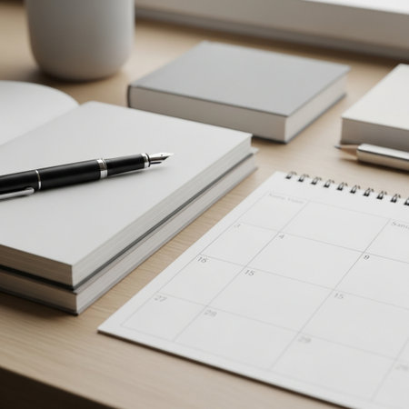 A cozy workspace featuring a calendar and stationery on a desk, perfect for organization and planning. Ideal for illustrating productivity and time management.