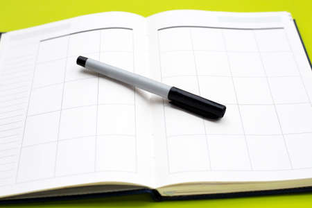 Weekly planner organiser with green sticky note on white background. Stationery flat lay. Back to school, office, business plan concept. Horisontal