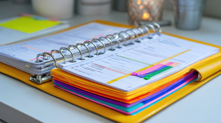 A vibrant planner displayed on a white desk, featuring colorful tabs and meticulous planning pages that inspire productivity and organization in a stylish workspace.