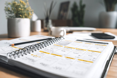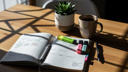 Planner lies open on a wooden desk, surrounded by stationery, plants, and a coffee cup, highlighting organization and productivity in a modern workspace
