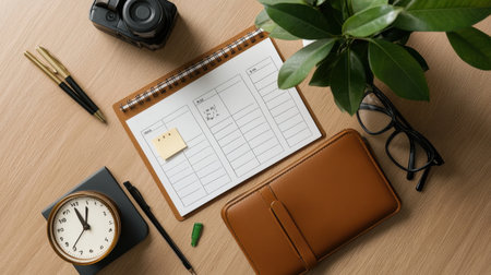 A stylish workspace featuring a planner, camera, glasses, and a plant. Ideal for conveying themes of organization, productivity, and creativity in a modern setting.