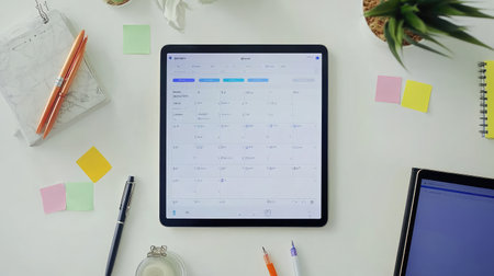 A clean and organized workspace featuring a digital tablet with a calendar app. Surrounded by colorful sticky notes, pens, and a green plant, it promotes productivity.