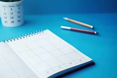 close up of calendar on the blue table background, planning for business meeting or travel planning concept
