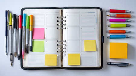 A vibrant arrangement of colorful stationery items including sticky notes, pens, and an open planner on a clean surface, perfect for enhancing productivity.