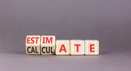 Estimate or calculate symbol. Concept words Calculate to Estimate on beautiful wooden cubes. Beautiful gray table gray background. Business, estimate or calculate concept. Copy space.