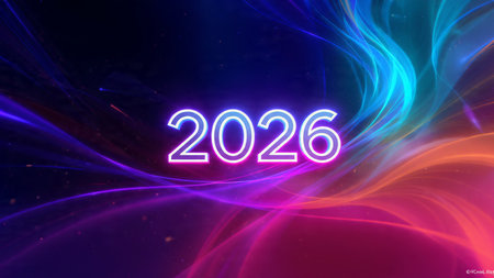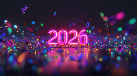 A lively and colorful 2026 celebration scene featuring vibrant neon lights and glittering confetti, perfect for festive events and joyful occasions.