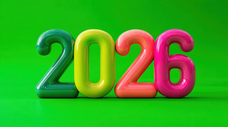 A vibrant and playful image featuring the colorful 3D representation of the year 2026 on a bright green background, perfect for celebrations or future-oriented marketing campaigns.