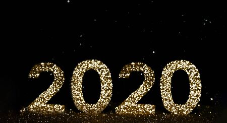 The numbers 2020 are written from sparkles. Template for a festive New Year card from beautiful bokeh. Happy New Year 2020.