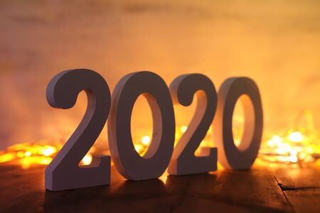 Background of 2020 happy new year concept, wooden numbers over table and gold darland lights background