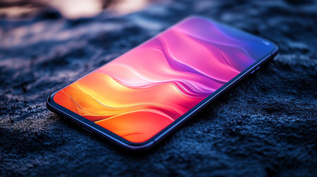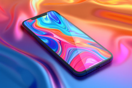 A modern smartphone with a gradient abstract screen on a colorful background. Sleek design, edge-to-edge display. Vibrant colors for tech, business, or lifestyle themes.@240805_
