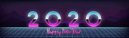 Happy New Year 2020 banner in 80s digital retro futuristic style. Glowing numbers 2020 on blue grid background. Cyberpunk vector illustration.