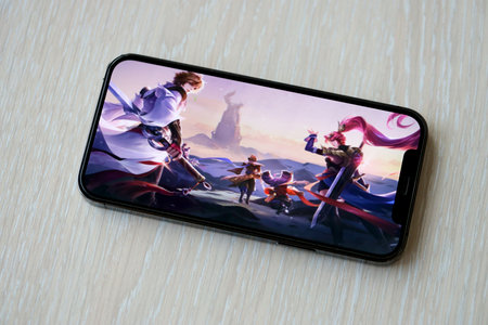 Honor of Kings mobile iOS game on iPhone 15 smartphone screen on wooden table during mobile gameplay. Mobile gaming and entertainment on portable device