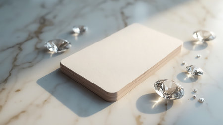 A collection of plain cards rests on a smooth marble surface, accented by shiny crystals scattered around. The soft glow enhances the sophisticated ambiance of the setting.