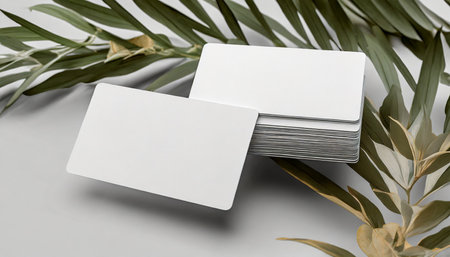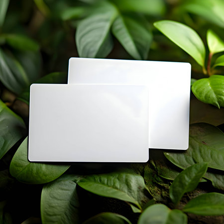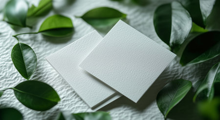 Two blank white cards rest on a textured surface, framed by vibrant green leaves. The arrangement creates a calm and natural atmosphere, ideal for creative projects.