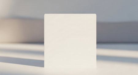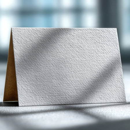 A close-up shot of a blank, textured card standing upright. The card has a subtle shadow cast upon it, suggesting natural light.