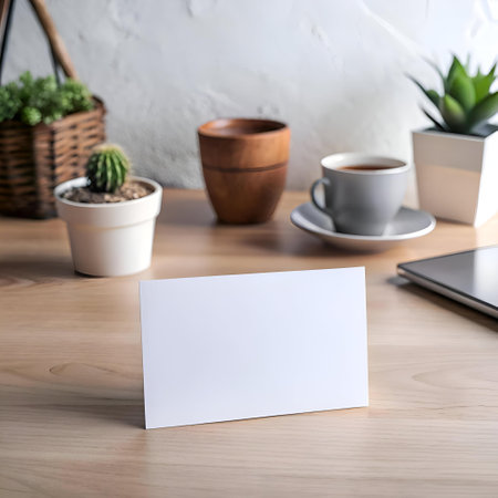 Blank white card mockup on a wooden table with blurred background of a coffee cup. potted plants. and tablet. Perfect for showcasing your design or message.