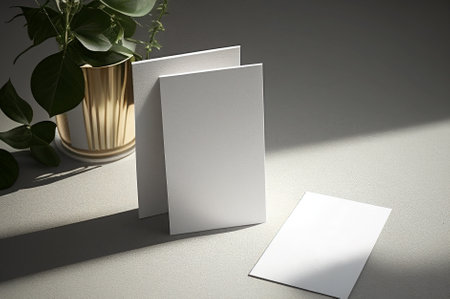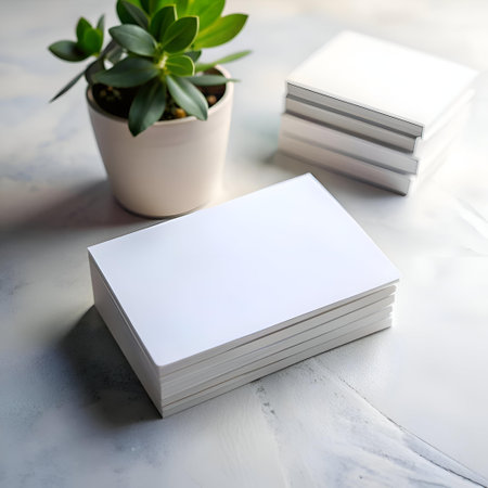 Clean and minimalist mockup featuring a stack of blank white cards with a potted plant in the background. Perfect for showcasing your design. branding. or typography.