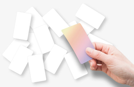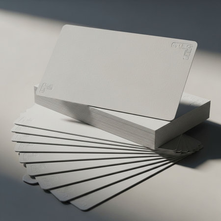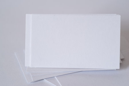 Mockup of a fanned stack of business cards on a white textured paper background, high-angle shot, minimalist style