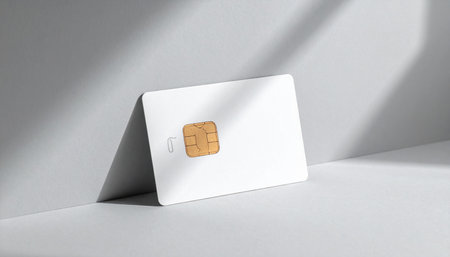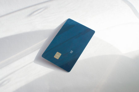 Plastic credit card with chip visible, on top of a table with soft lights and shadows. Colored card on white surface. Concept: finance, purchases, payments, loan, spending, investments and debts.